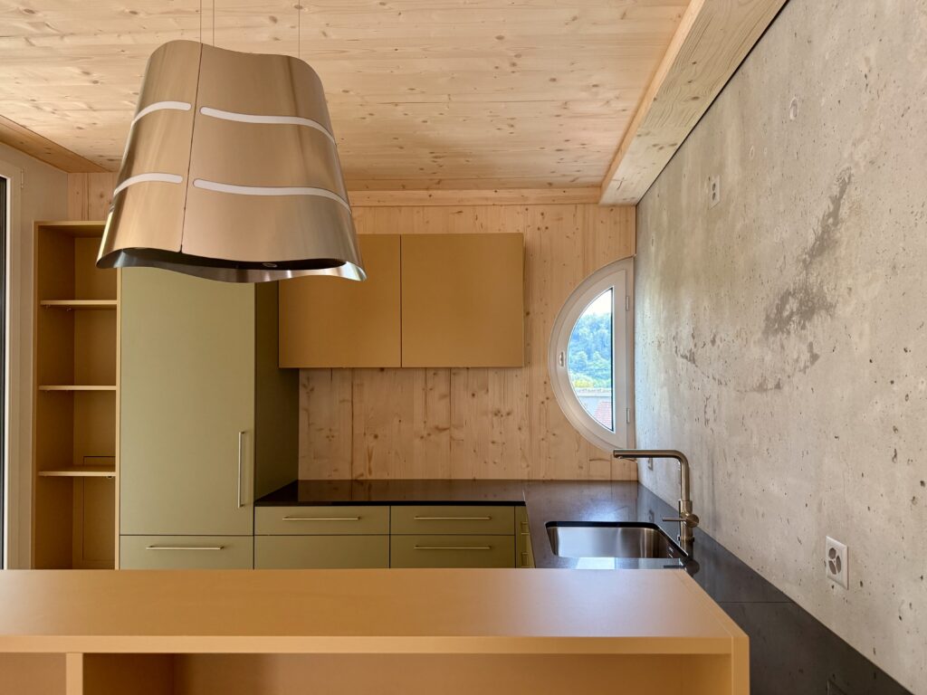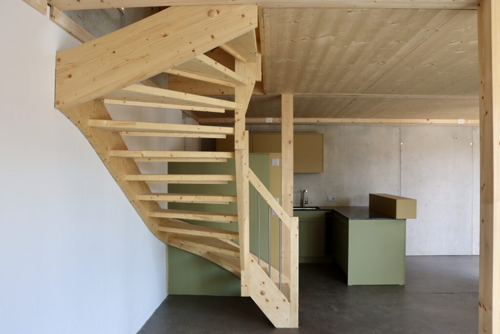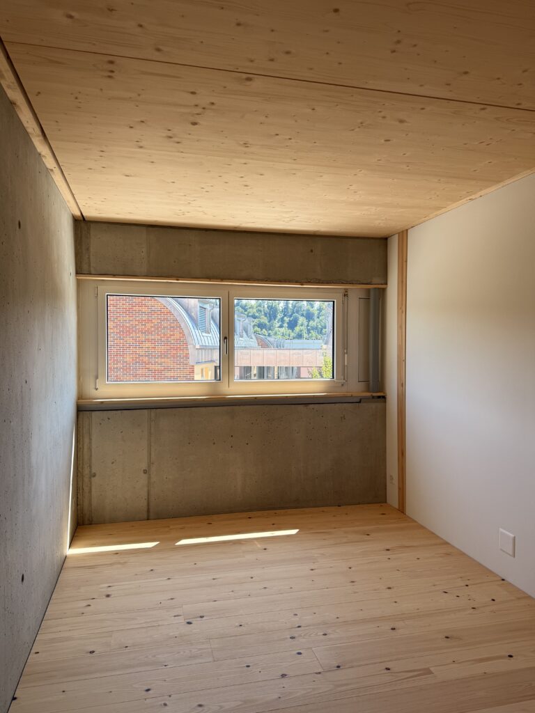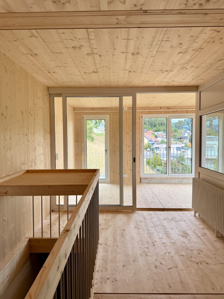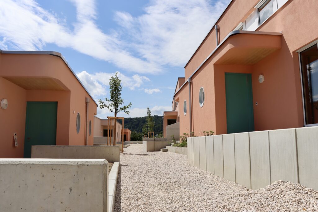 Das architektonische Konzept arbeitet mit einer ausgewogenen Kombination aus Holz und Beton, die zugleich elegant und funktional wirkt. Die Maisonettehäuser bieten komfortablen Wohnraum für vierköpfige Familien und fördern die Entstehung einer angenehmen Gemeinschaft.